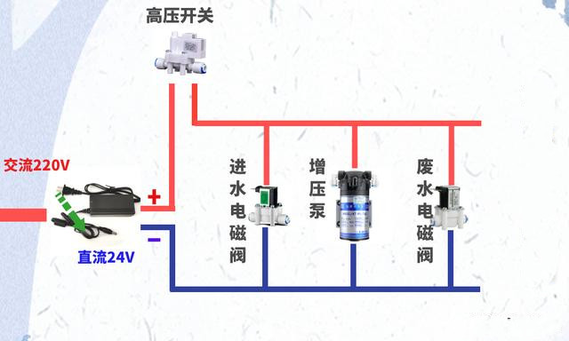 廢水電磁閥,控制廢水的排放,可以直接用普通的開關代替,通過旋鈕的開合程度來控制廢水量,嚴禁將廢水開關關掉。
