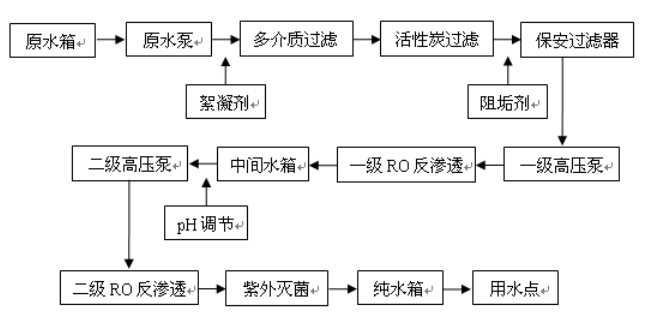 從上圖我們可以看到,商用凈水設備的工藝流程主要是:原水箱→原水泵→多介質過濾器→活性炭過濾器→保安過濾器→高壓泵→反滲透過濾器(單級/多級)→純水箱。